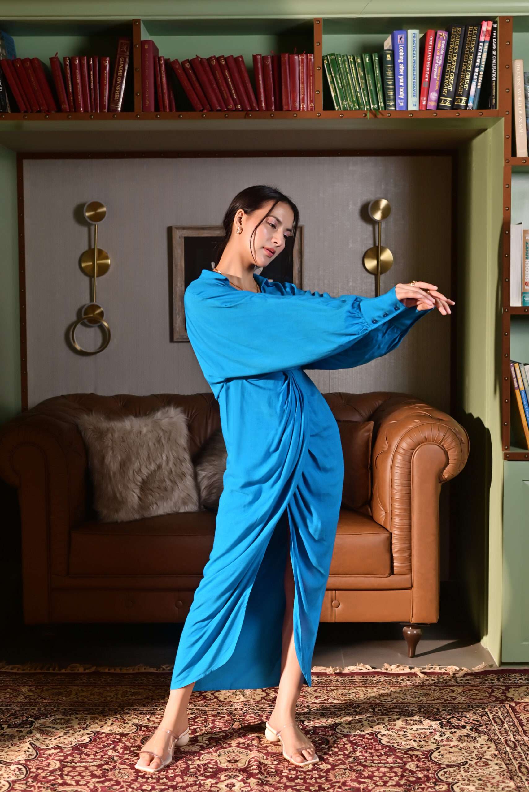 Discover elegance with this charming blue wrap midi dress, crafted from 100% rayon for a luxurious feel. The overlapping body creates a flattering silhouette, while dolman sleeves with heightened cuffs add a touch of sophistication. The loose-fitting design ensures comfort, complemented by a draped skirt that moves gracefully. With its exceptional fit and timeless style, this dress is perfect for any occasion.