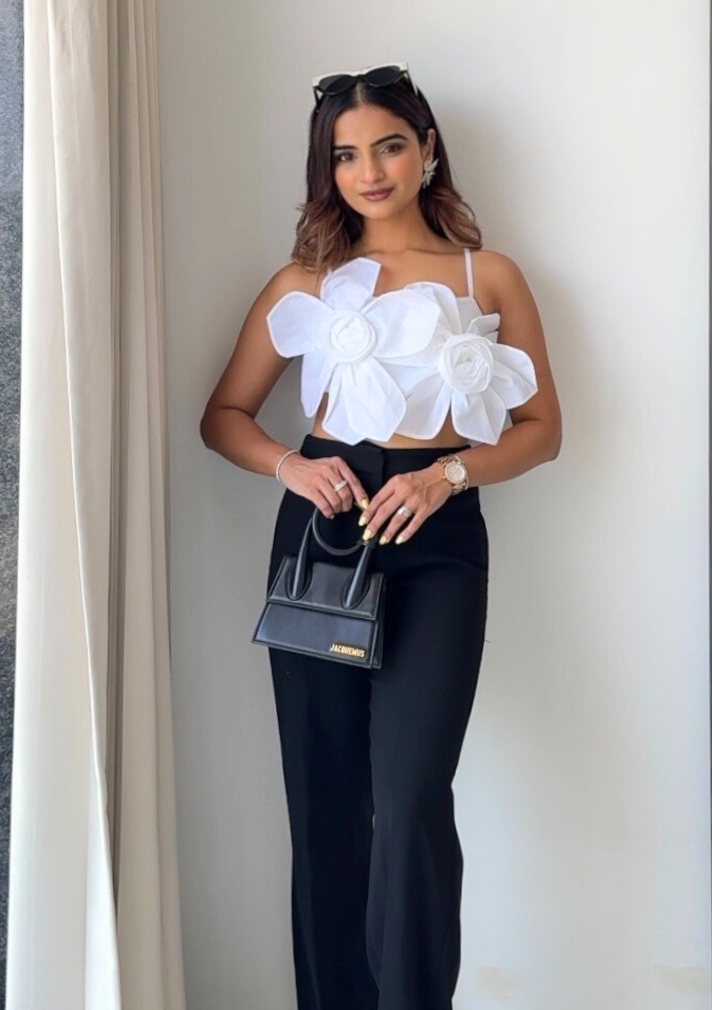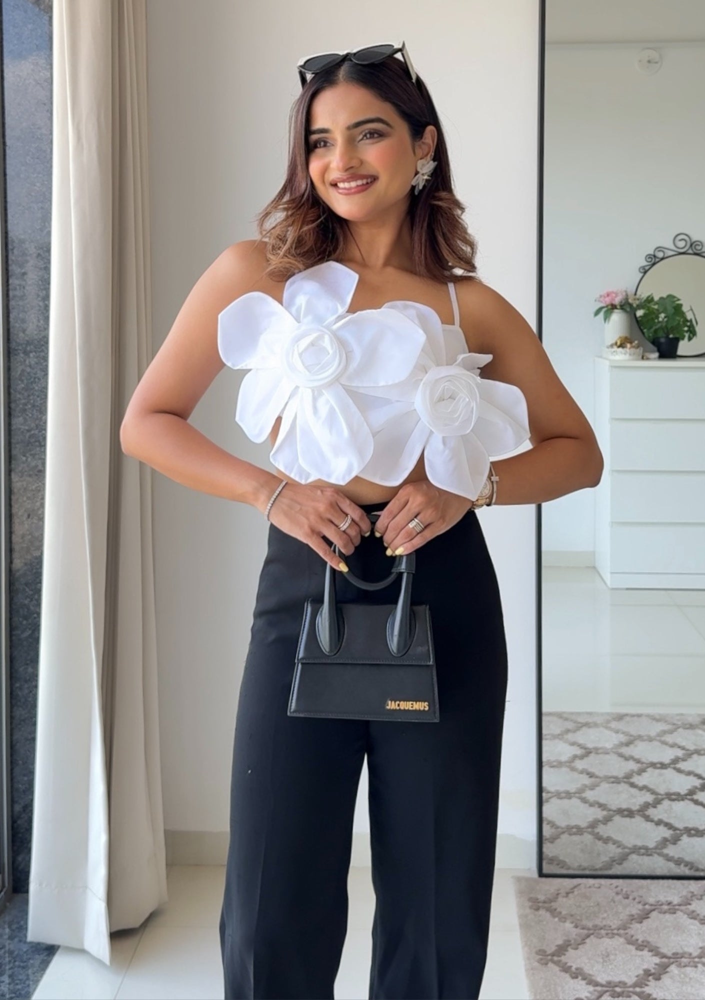 This white crop top, crafted from luxurious taffeta fabric, is the epitome of cuteness. The back features smocking for a perfect, comfortable fit, while the front is adorned with two charming 3D flowers. This top effortlessly combines elegance and playful details, making it a standout piece in any wardrobe.