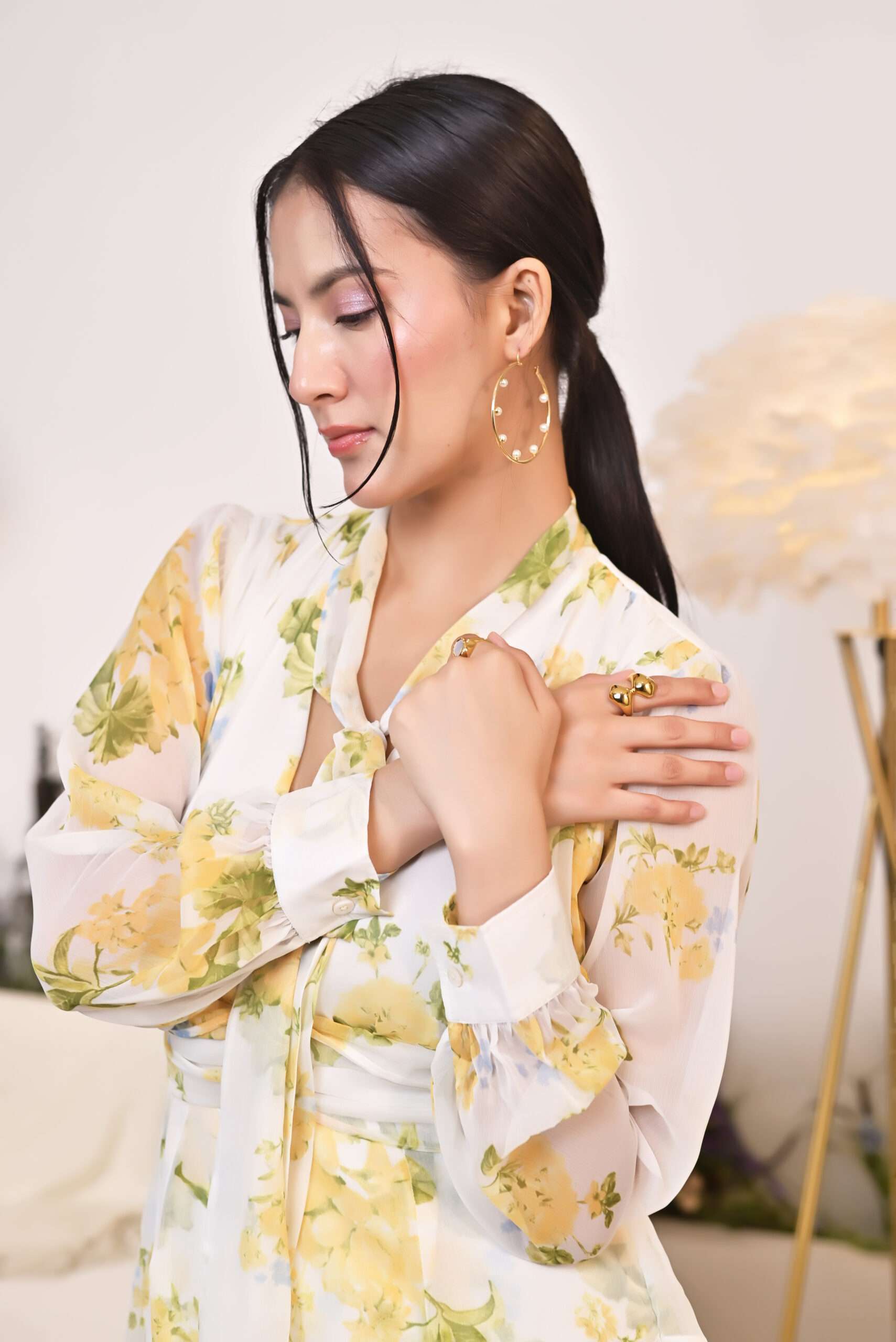 Embrace the summer in this delightful short dress, featuring a fresh yellow print on a white chiffon base. Designed for comfort and style, the dress boasts a loose-fitting body with a long tie band at the neck and long sleeves with cuffs. The three-layer skirt adds a playful touch, making it the perfect combination of elegance and ease. This chiffon dress is your go-to for the most stylish summer outings.