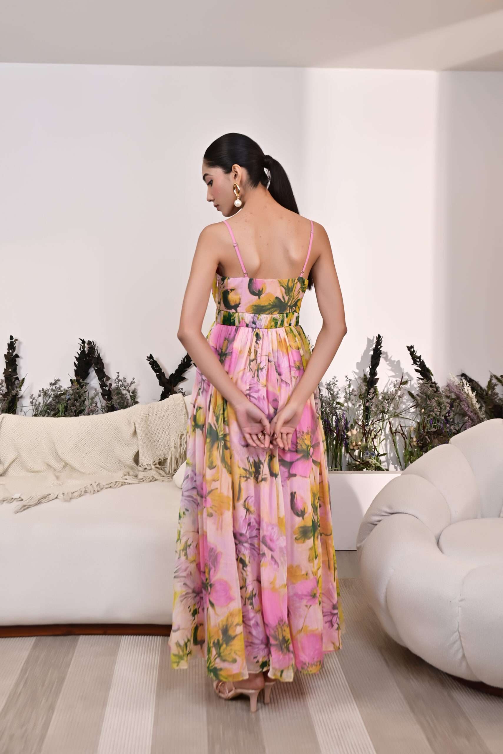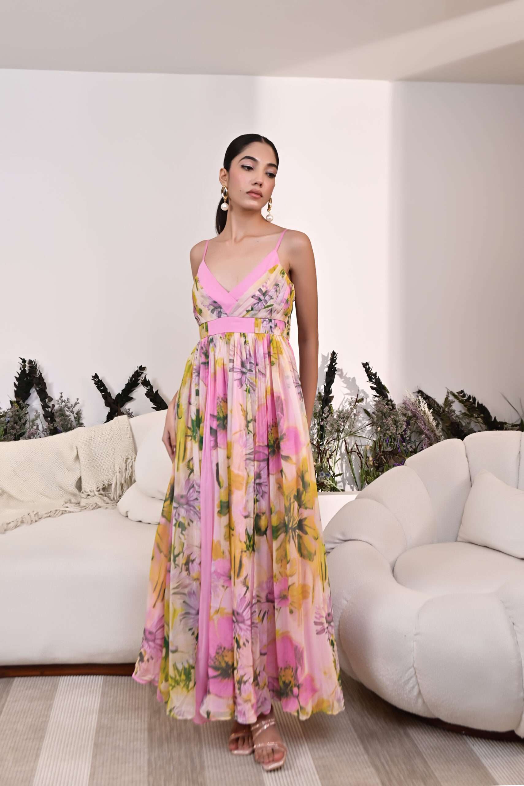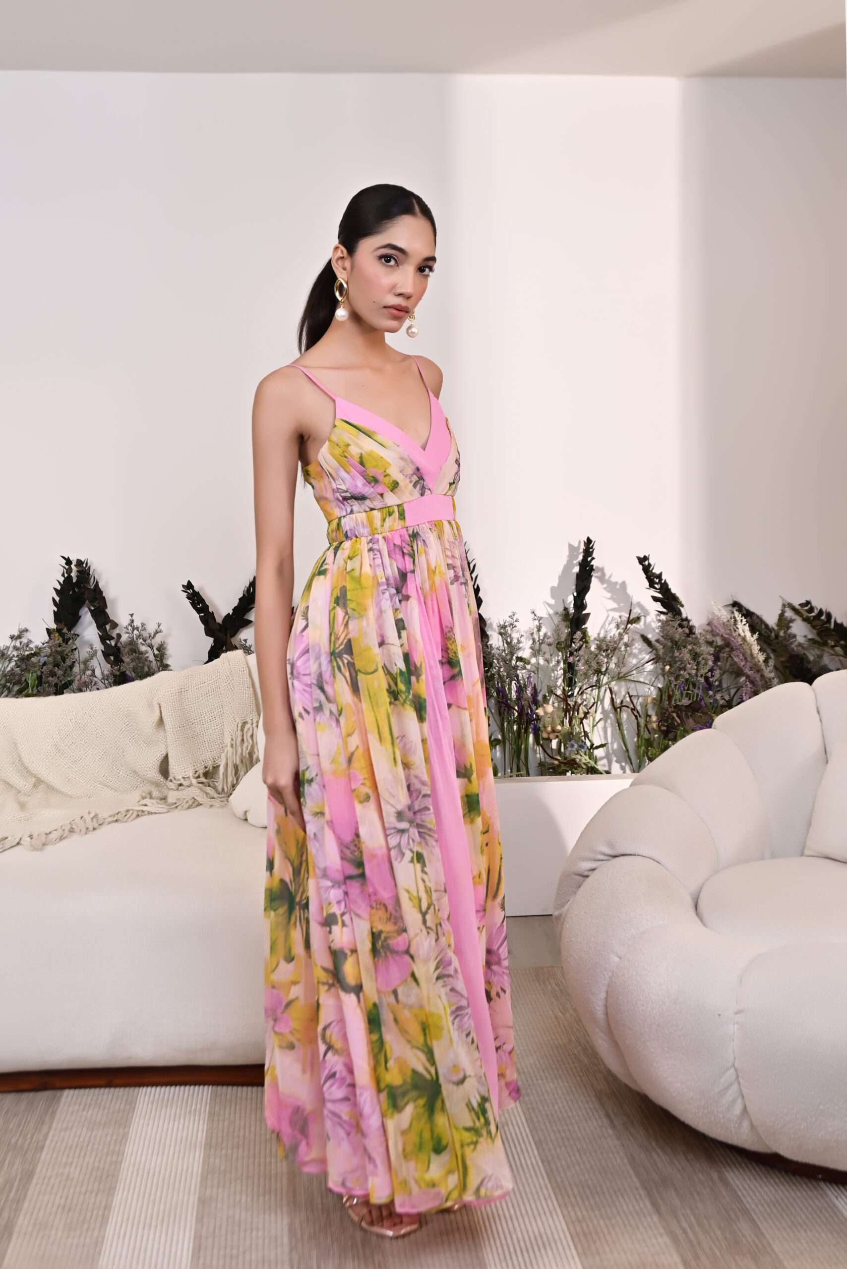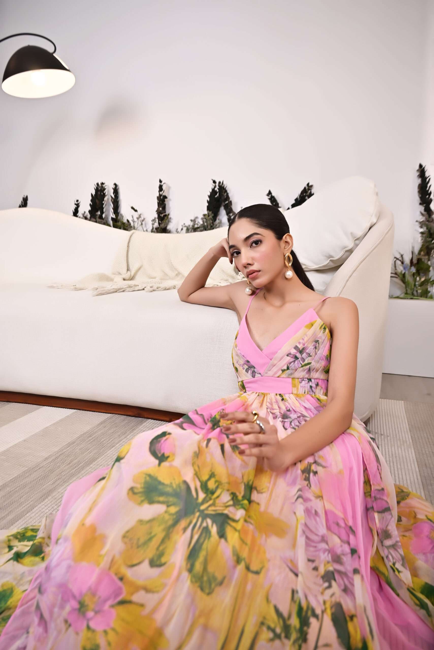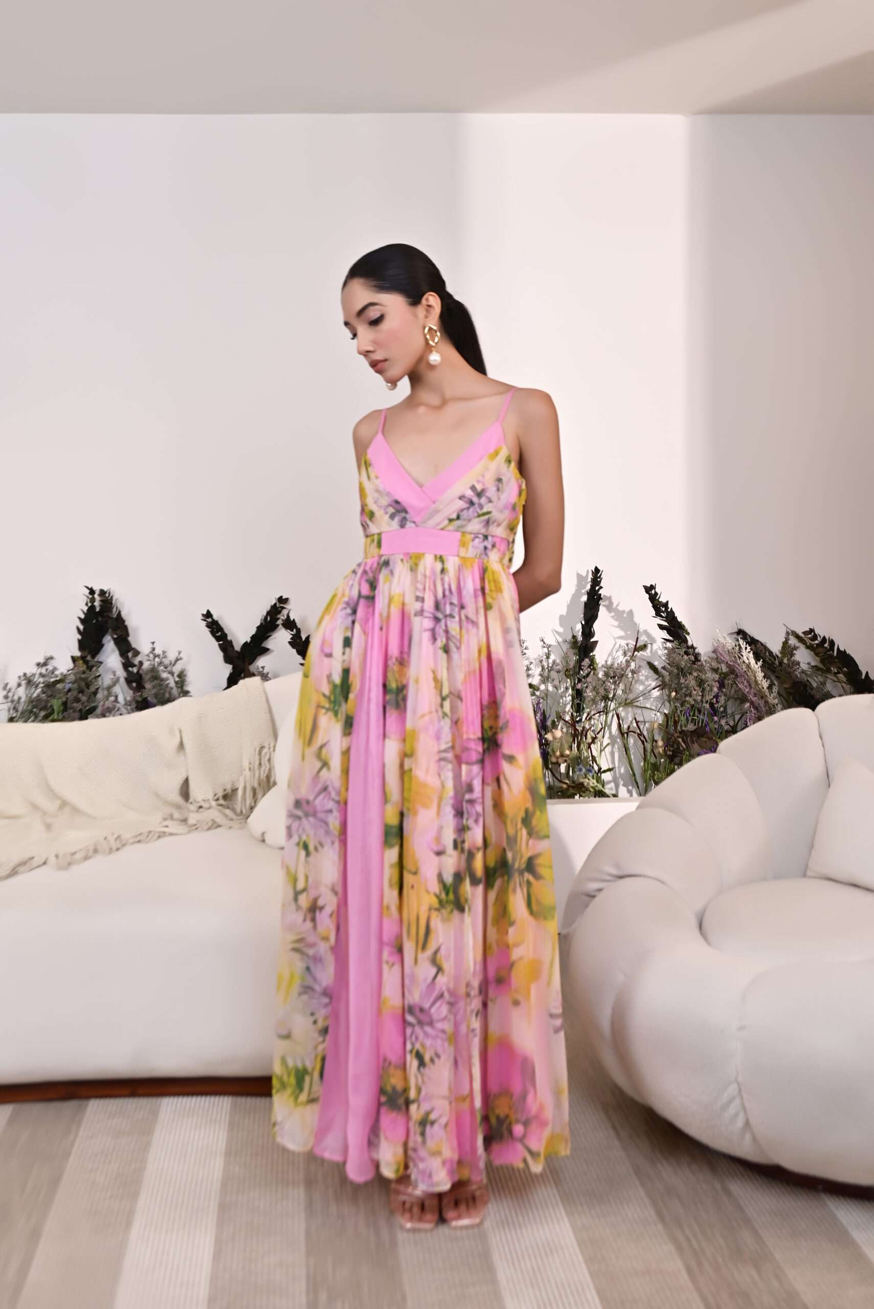 Experience the elegance of this long maxi chiffon dress, designed with layers for a flowing, ethereal effect. The bodice features elegant pleats, while the skirt showcases a stunning first layer with XL floral hand-painted watercolor prints. Beneath, a contrasting solid color chiffon layer adds depth and sophistication. A front cutout in the skirt reveals the underneath layer as you walk, creating a dynamic and graceful movement. Perfect for making a dramatic entrance at any event.