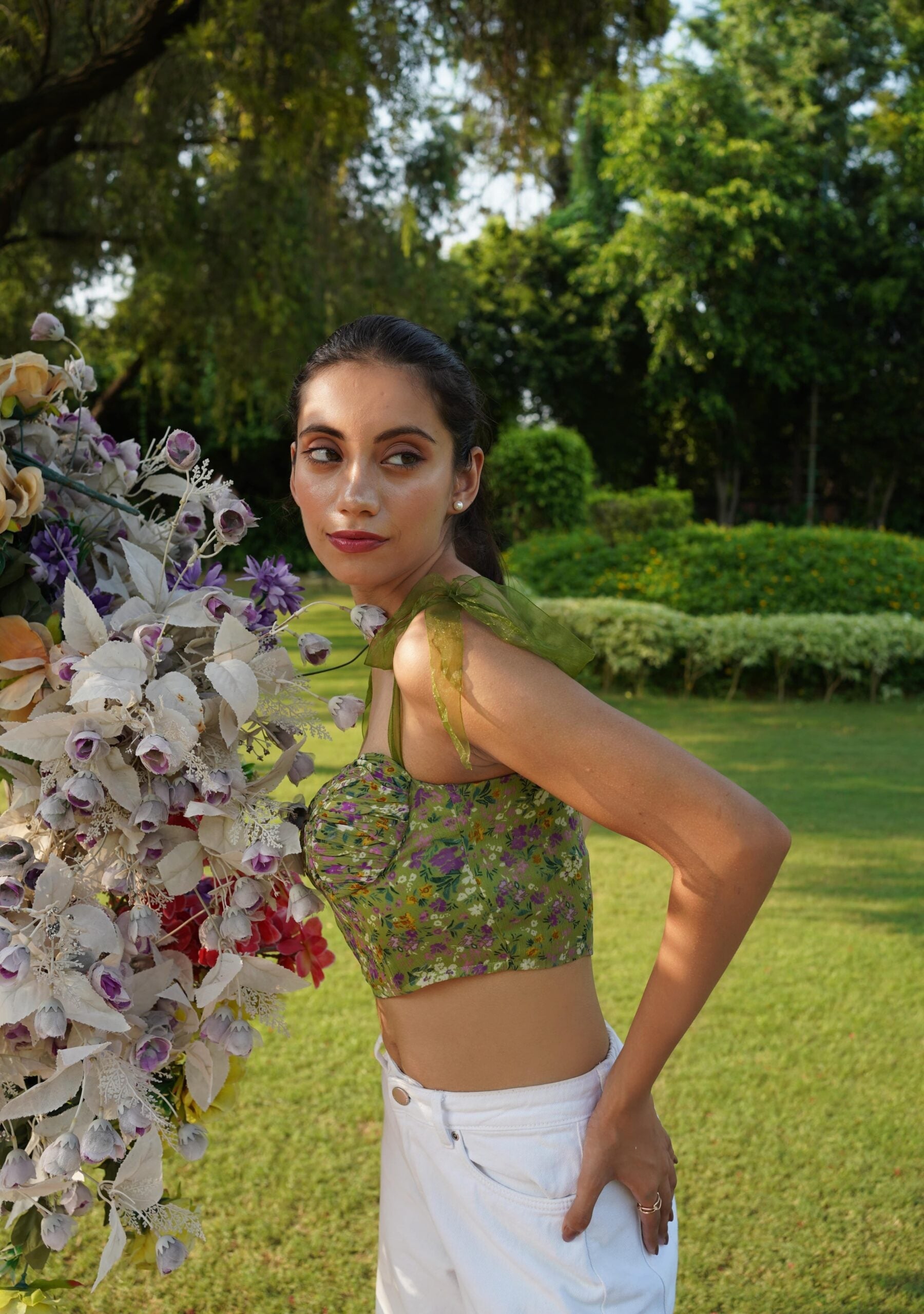 Elevate your style with this charming green printed corset top, designed for both day and night. It features a structured flattering fit, while a sleek metal zipper at the back ensures easy wear. Organza ties on the shoulders allow for customizable adjustments, so you can perfect the neckline to your preference. A sophisticated yet versatile piece that effortlessly transitions from casual to evening wear.