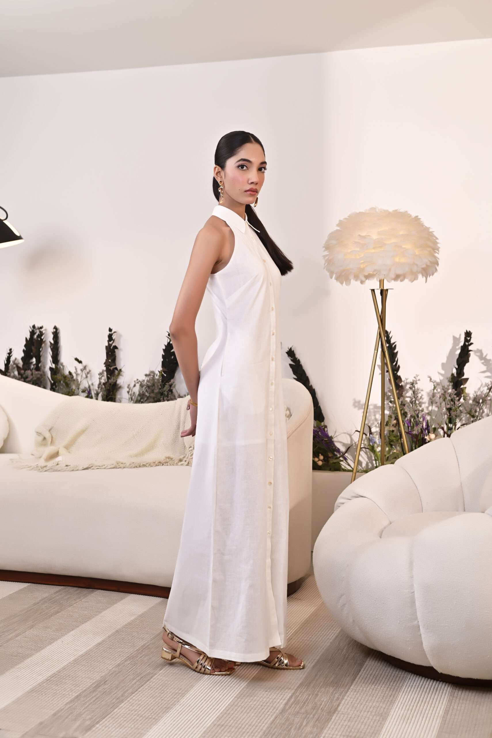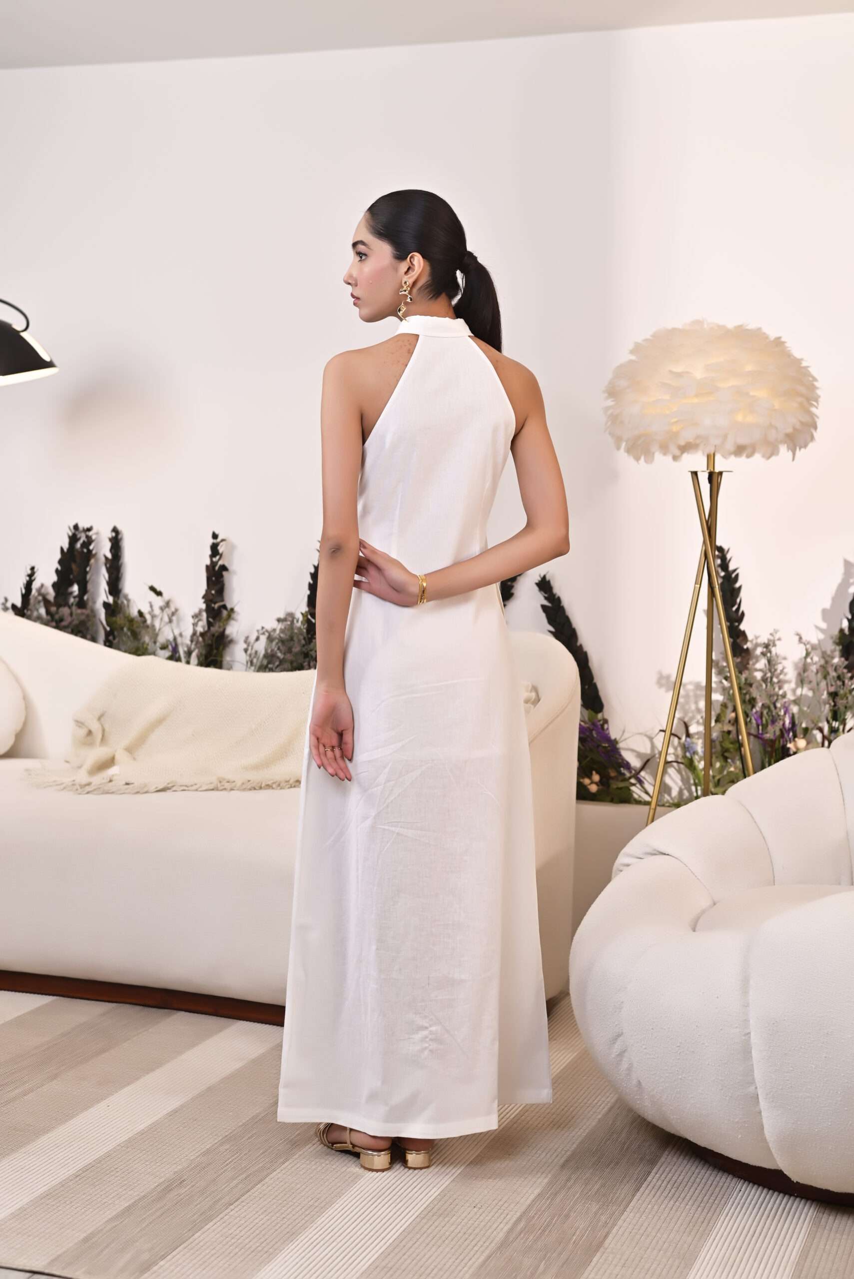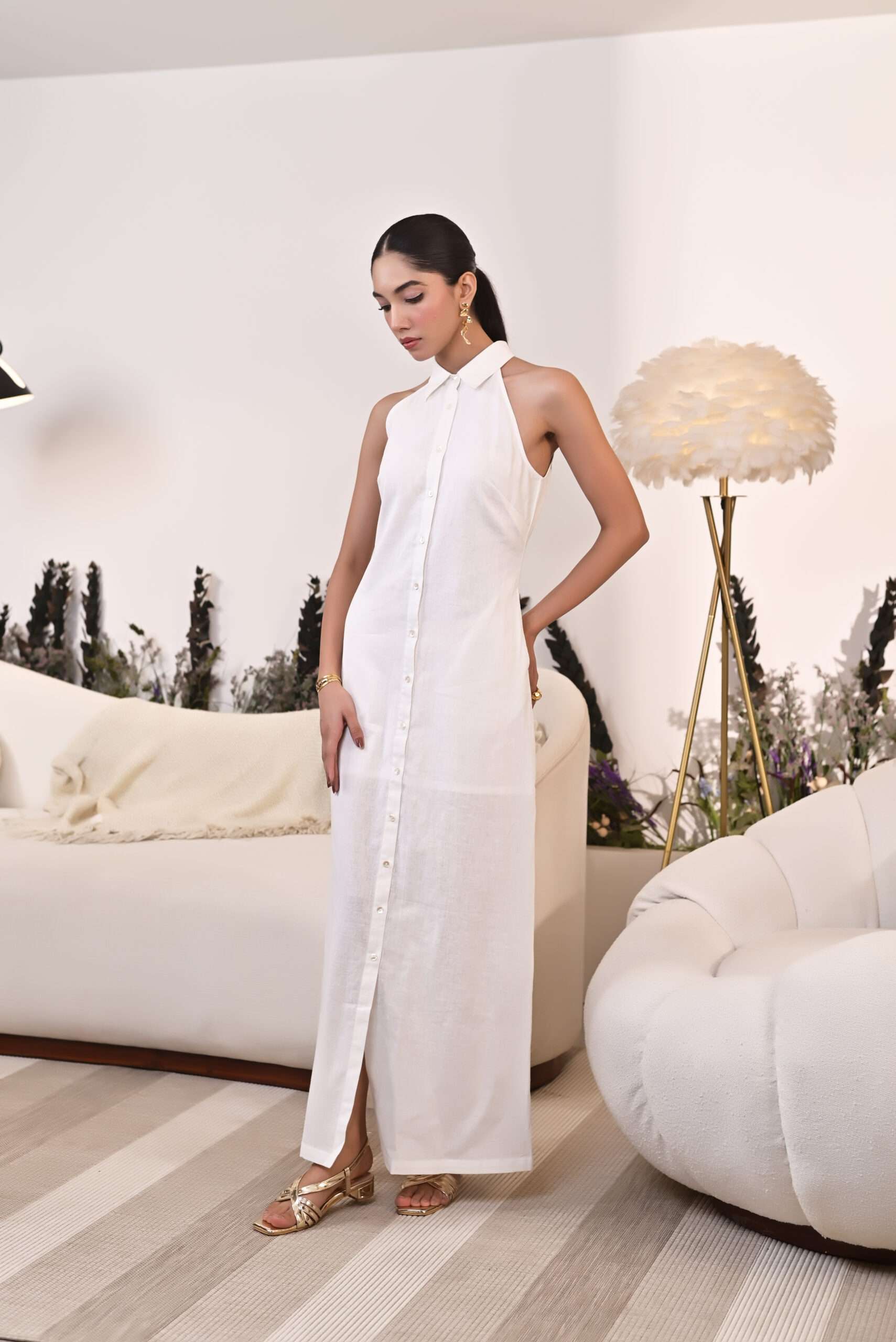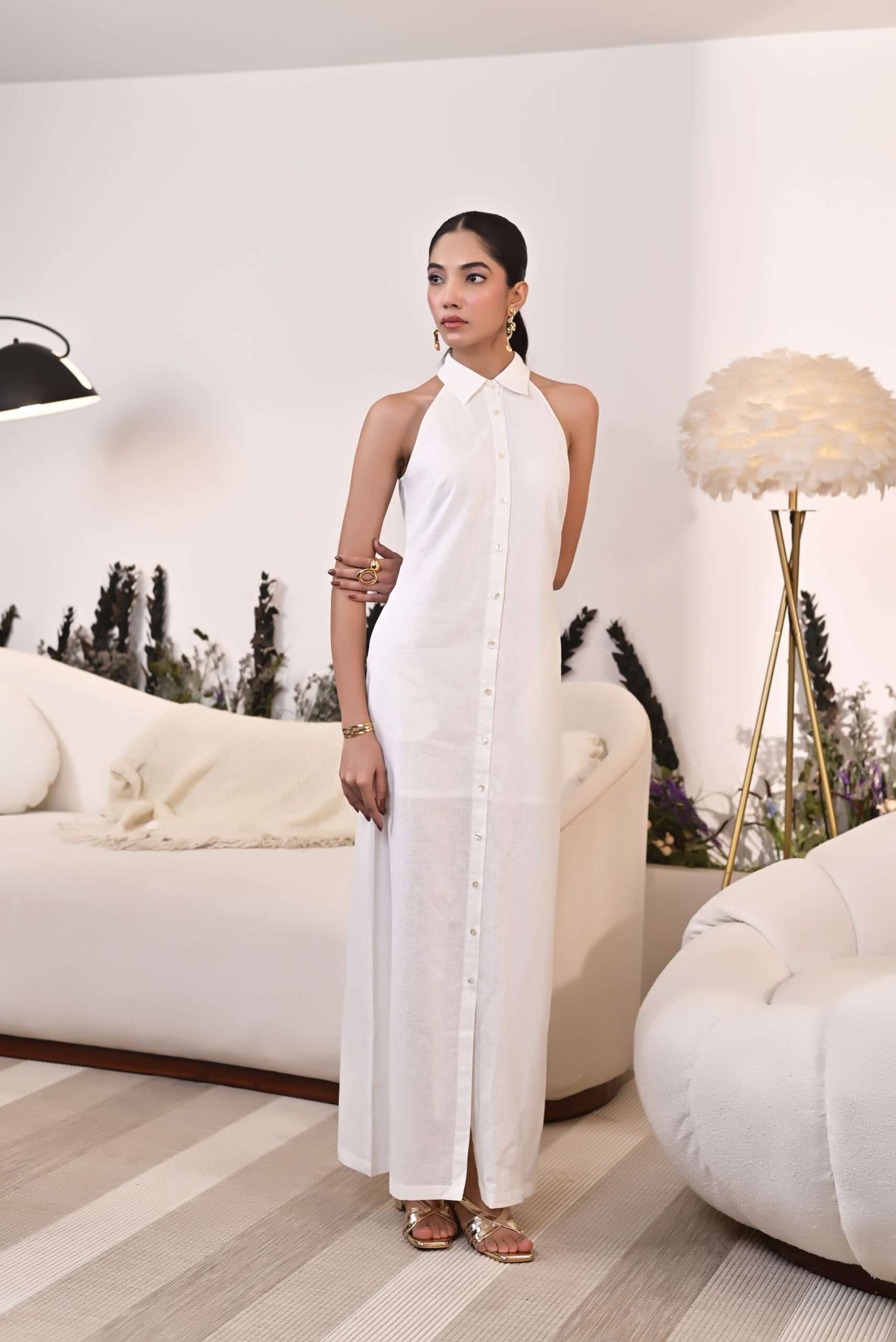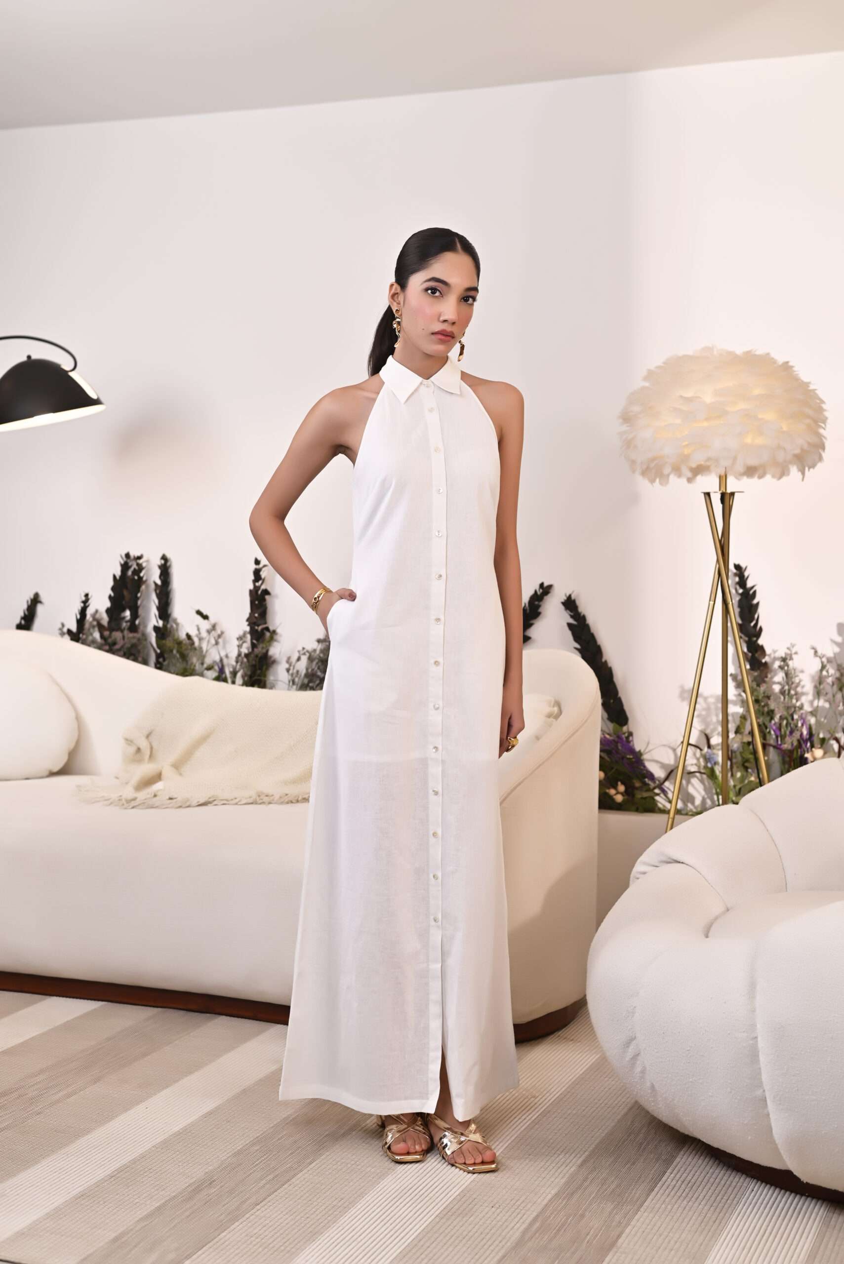 Elevate your wardrobe with this elegant long button-down shirt dress, crafted from pure cotton flex for a luxurious feel. The halter neck design and classic collar add a touch of sophistication, while the sea shell buttons provide a stylish and unique detail. With convenient side pockets and a perfect fit, this dress combines high-end vibes with practical elegance, making it a must-have for any chic, modern wardrobe.