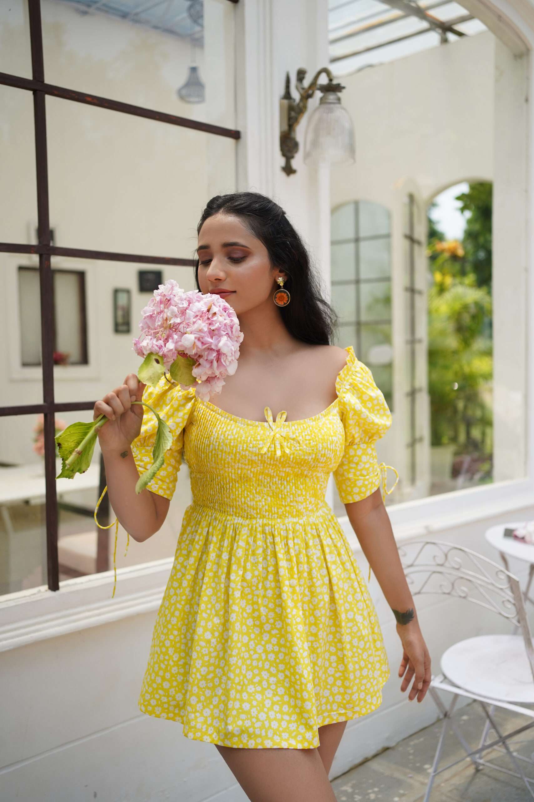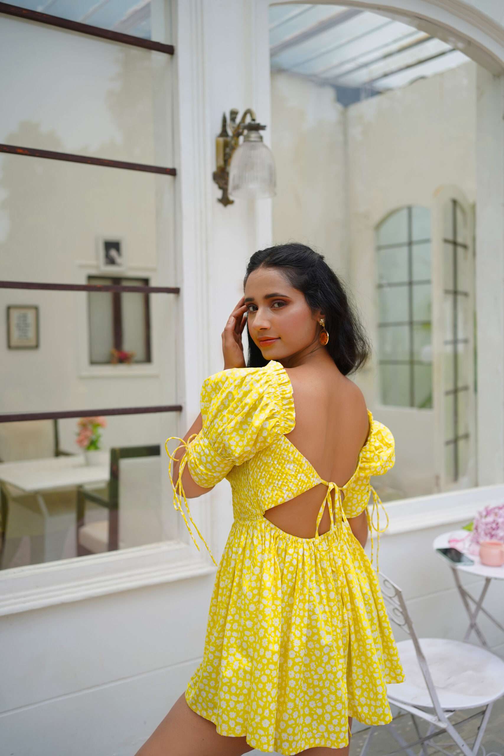 This charming mini dress, made from soft yellow poplin, features a delightful white ditsy print, giving it a Pinterest-worthy vibe. The dress boasts elegant pleats on the bodice and a stunning open back with adjustable pleated panels. Puff sleeves add a touch of whimsy, making this dress perfect for sunny days and playful outings.