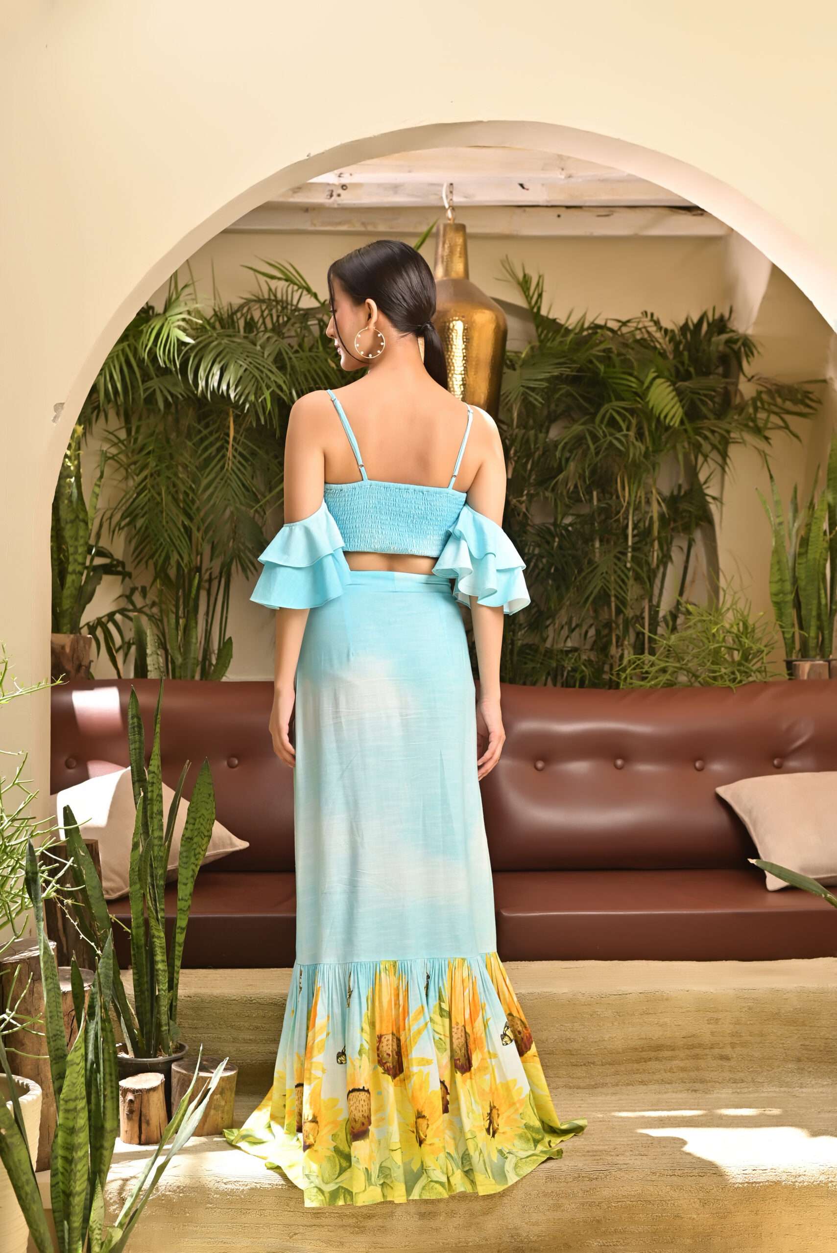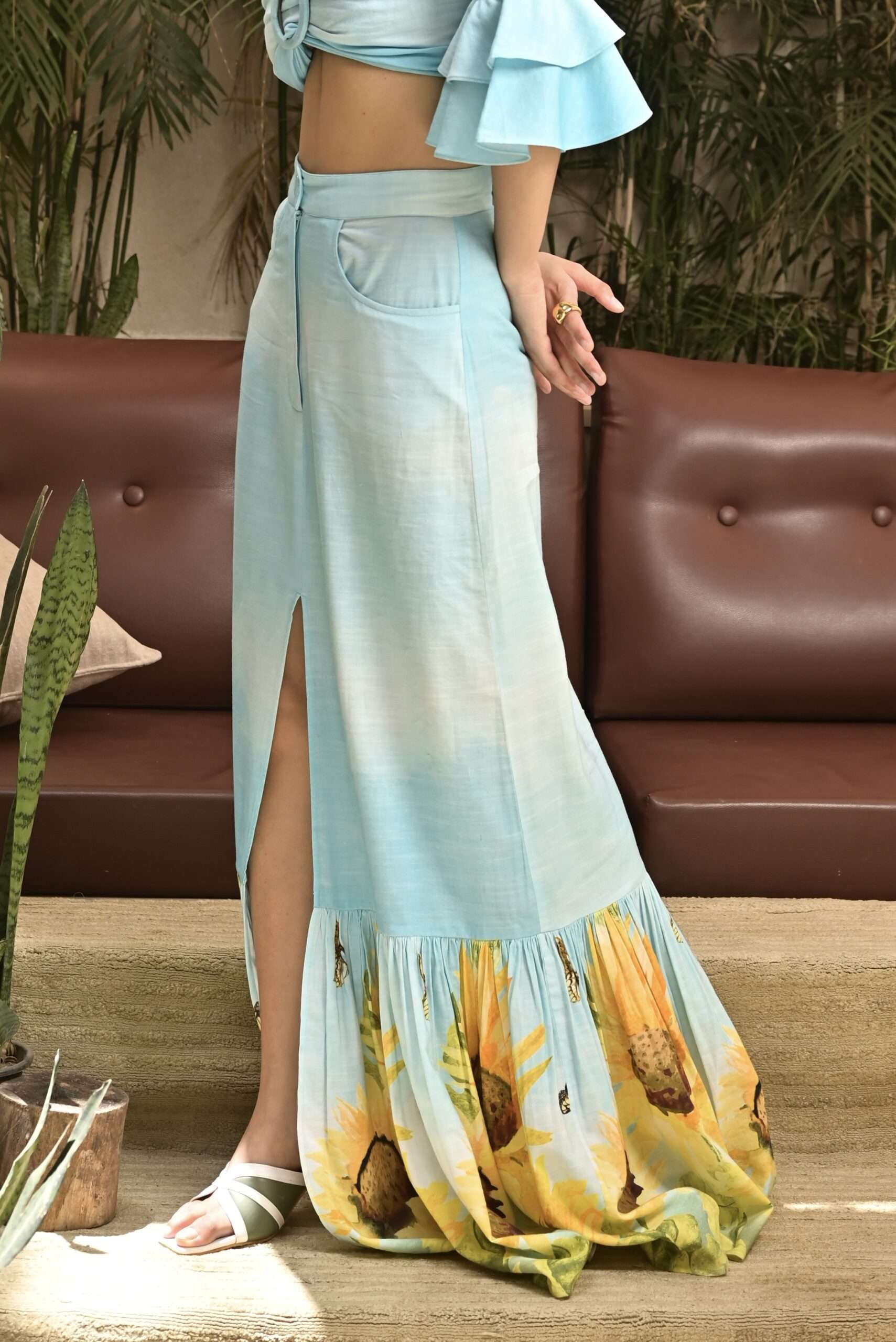 The matching floor-length skirt features a striking giant sunflower print on the border, turning heads wherever you go. The skirt’s straight cut is complemented by a sexy front split, revealing a hint of leg while maintaining an elegant silhouette. The frill at the bottom, adorned with the same sunflower print, adds a touch of flair and completes this standout set.