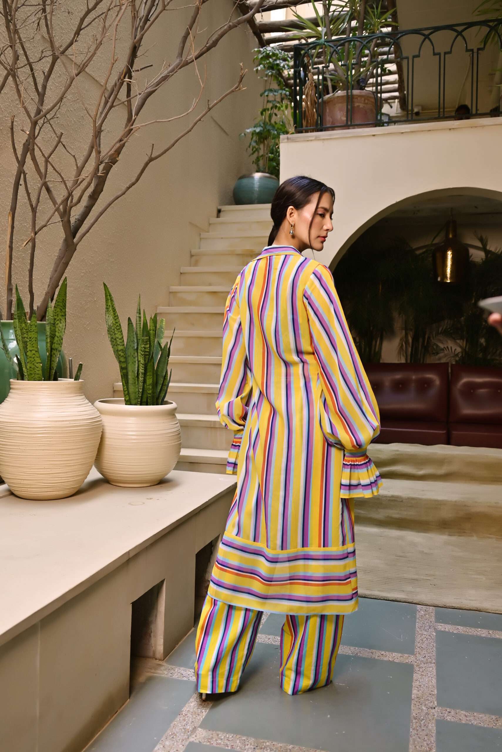 Layer this with the multi-color striped georgette shrug, designed with puff sleeves and flared cuffs for an elegant yet relaxed look. The set is completed with matching high-waisted pants in cotton flex, adorned with the same colorful stripe pattern. These pants offer a straight-leg fit with practical side pockets and a coordinating fabric belt, creating a cohesive and stylish outfit perfect for any occasion.