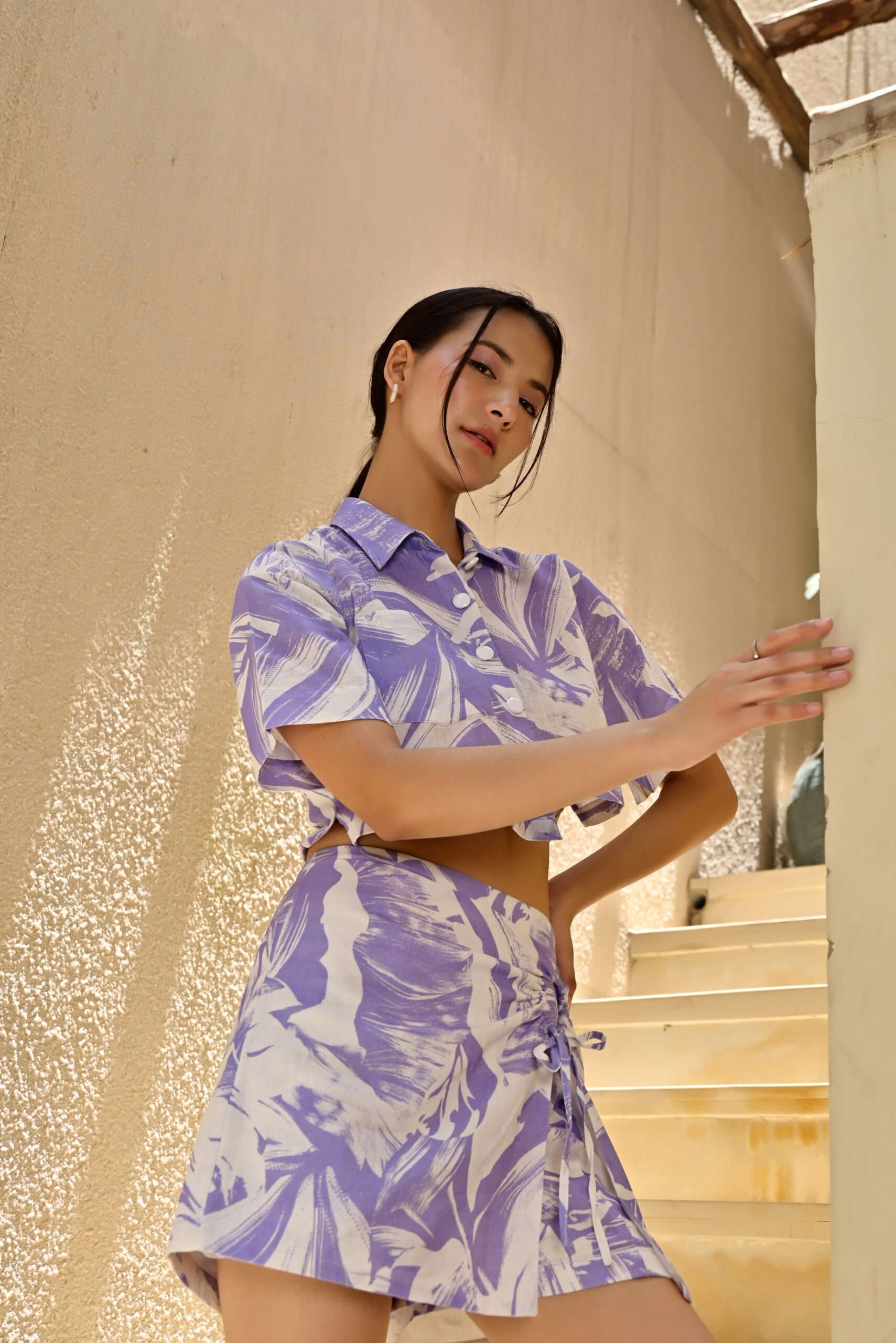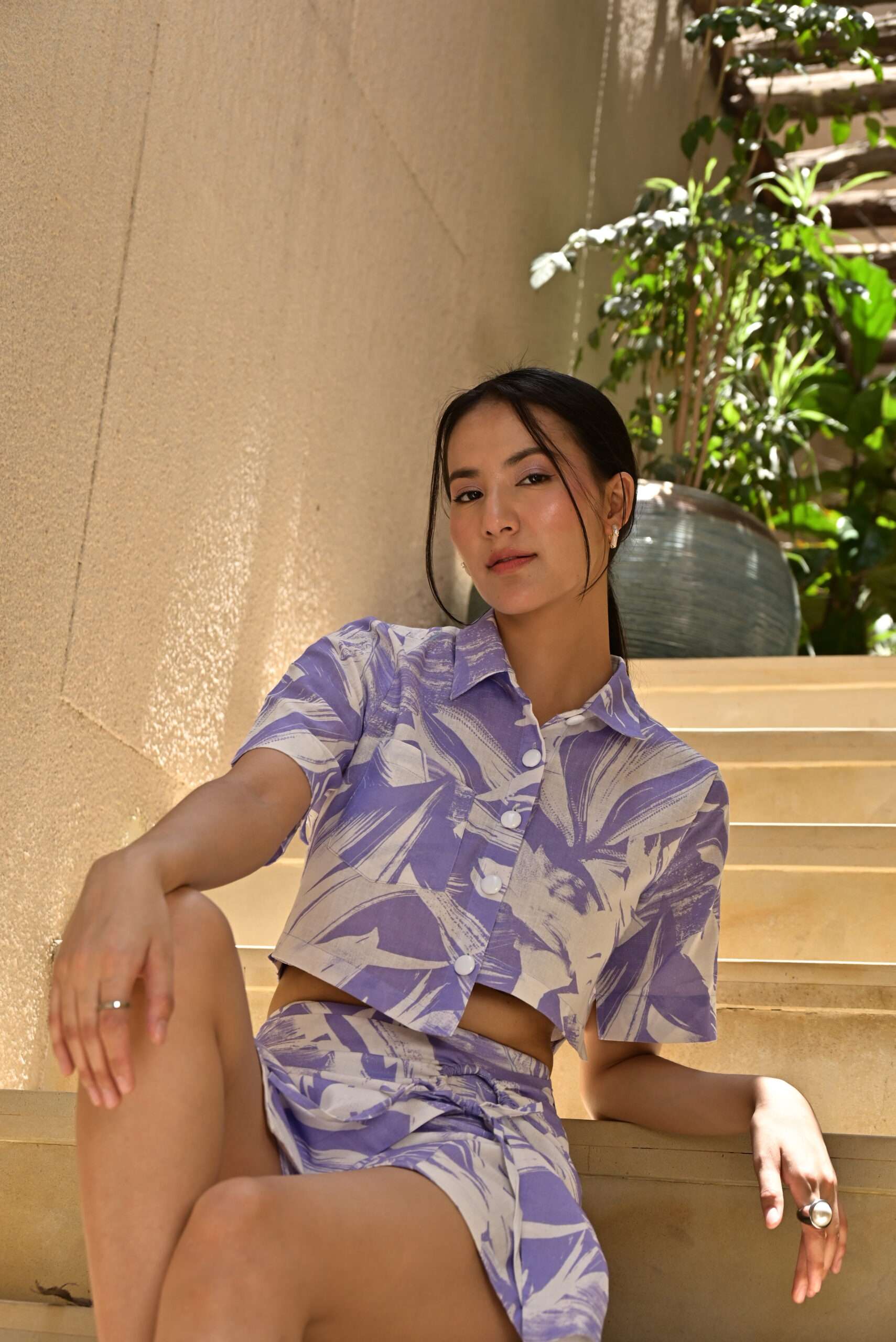Embrace effortless style with this chic abstract lilac co-ord set. The crop shirt features a charming lilac and white abstract print, a cute pocket detail, and white decorative buttons that enhance its playful appeal. Paired with the matching skort, which combines the elegance of a skirt with the practicality of shorts, this set is both stylish and functional. The skort also showcases the same abstract print and includes a convenient side zipper. Perfect for a coordinated look that’s both fashionable and versatile.