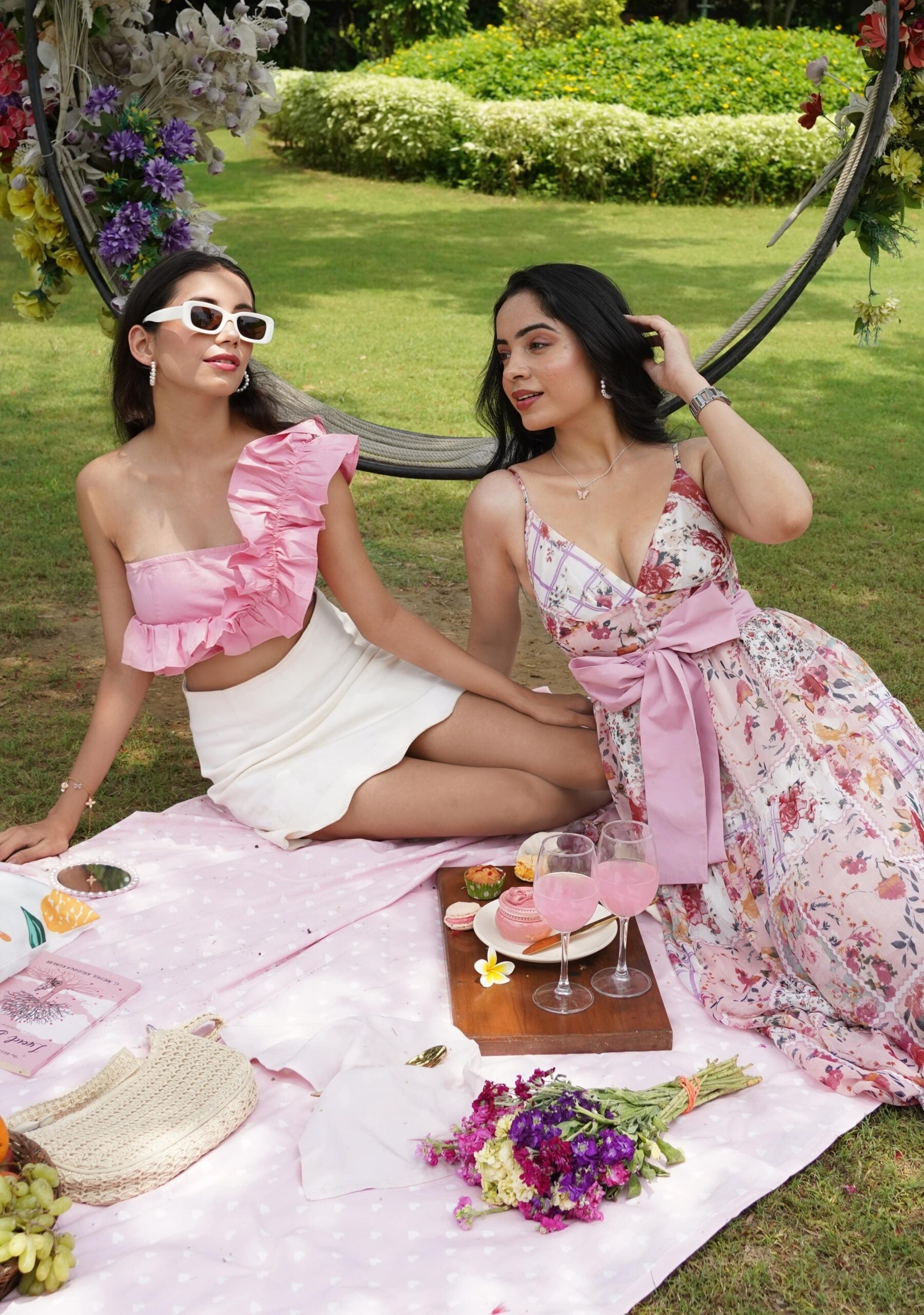 This pastel pink crop top features a playful one-shoulder design with a ruffle detail attached to the front, adding a touch of whimsy. The back is adorned with smocking, ensuring a comfortable and adjustable fit for every body type. Versatile and stylish, this top can be dressed up or down for various occasions.